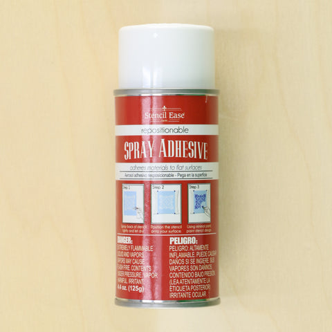 This spray will make any flat product tacky and able to stick on any surface even the ceiling. Great for many other uses from stenciling to posting art on a wall. Does not leave residue and allows the stencil to be picked up and moved repeatedly. A light spray coating is all that is necessary. It will dry and remain tacky allowing stencils to be repositioned many times. Also great for making work surfaces tacky to hold paper or fabric in place while being used. One can (4.4 OZ) will last for many projects. Oak Lane Studio brand spray adhesive was designed for use on smooth surfaces like walls, smooth floors, fiberglass, metal, plastic and more. It is not recommended for pavement, concrete or brick.